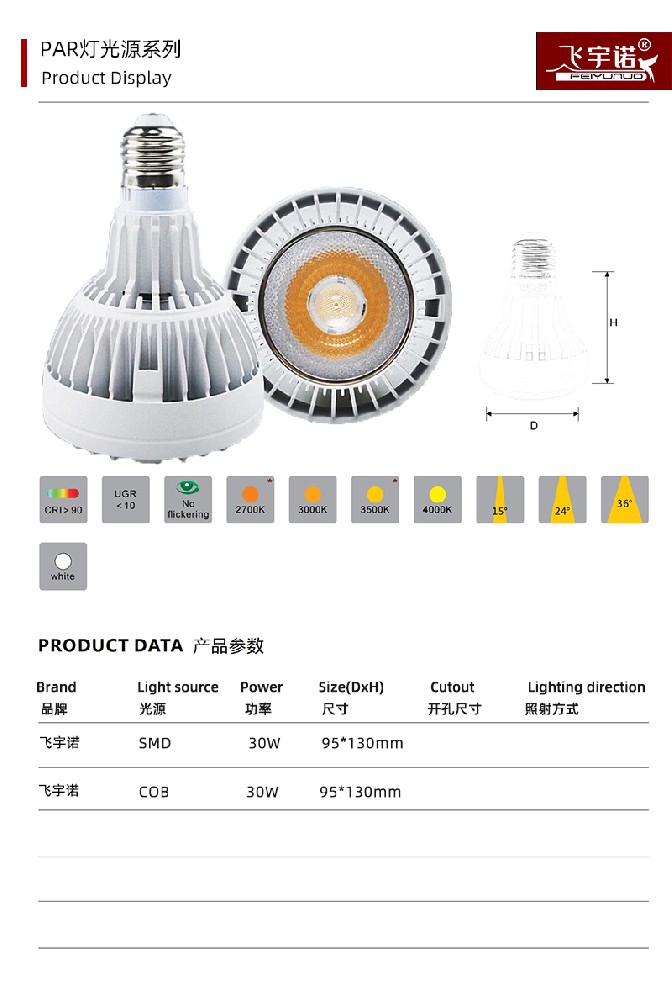 功率:30W燈體顏色:灰色、白色色溫:2700K-6500K發(fā)光角度:15° 24° 36° 60°產(chǎn)品描述:PAR燈光源 PAR30射燈燈泡 不帶風(fēng)扇COB款